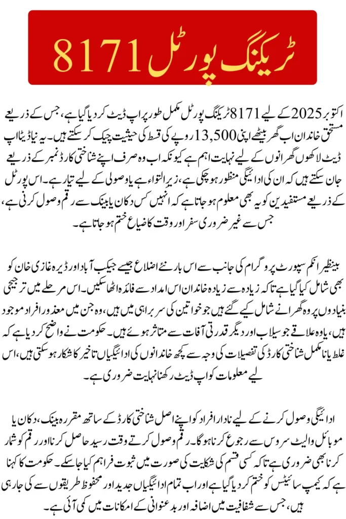 The updated 8171 Tracking Portal October 2025 has made it easier than ever for families to verify their Rs13,500 installment online. By checking your payment status before visiting a collection point, you save time, avoid unnecessary travel, and ensure a smooth withdrawal process.