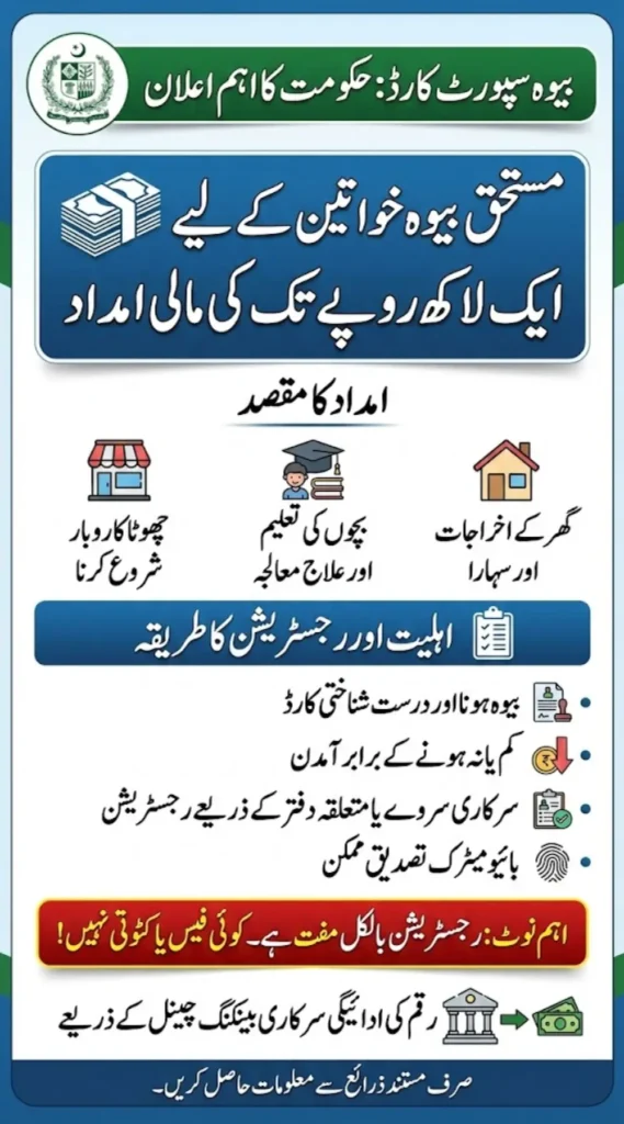 Eligible applicants must be widows with low or no income, possess a valid CNIC, and complete verification through the official survey and biometric process. Registration is completely free, and no agent fee is allowed. Payments will be transferred through official channels after approval. Widows are advised to apply through authorized offices and avoid fraudulent middlemen.