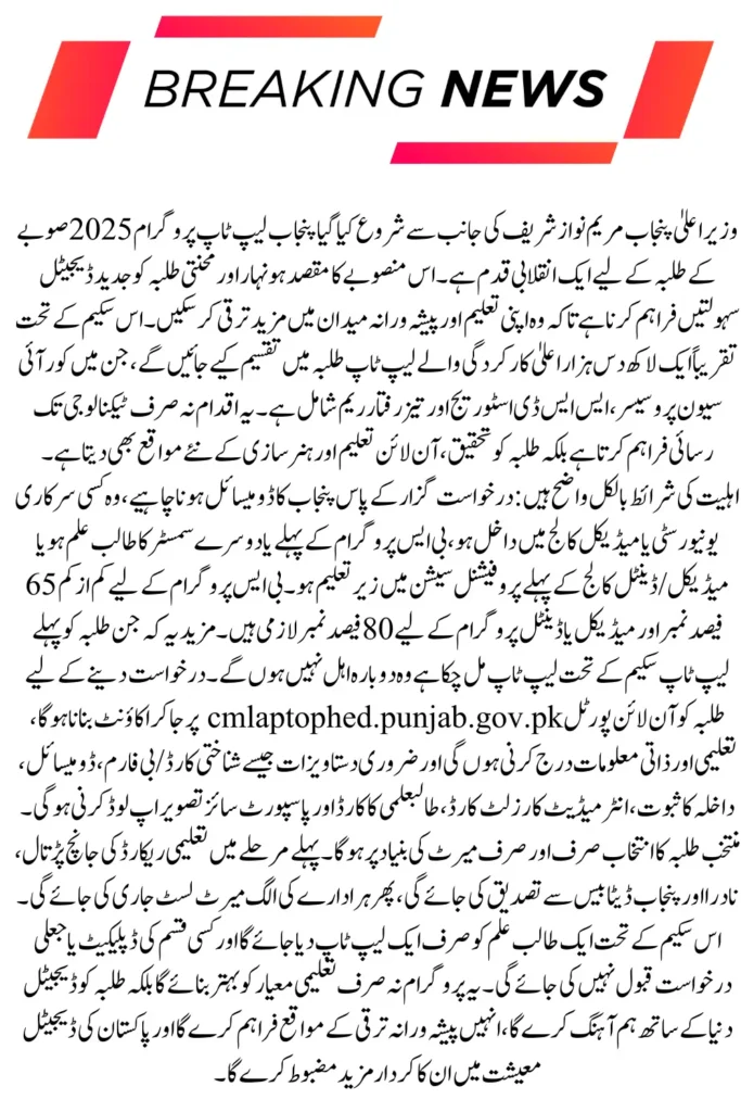 Chief Minister Maryam Nawaz Sharif has officially launched the CM Punjab Laptop Program 2025. This scheme aims to empower students with digital tools by providing free laptops to eligible students across Punjab. With this step, the government aims to close the digital divide and support students in their academic and professional growth.
