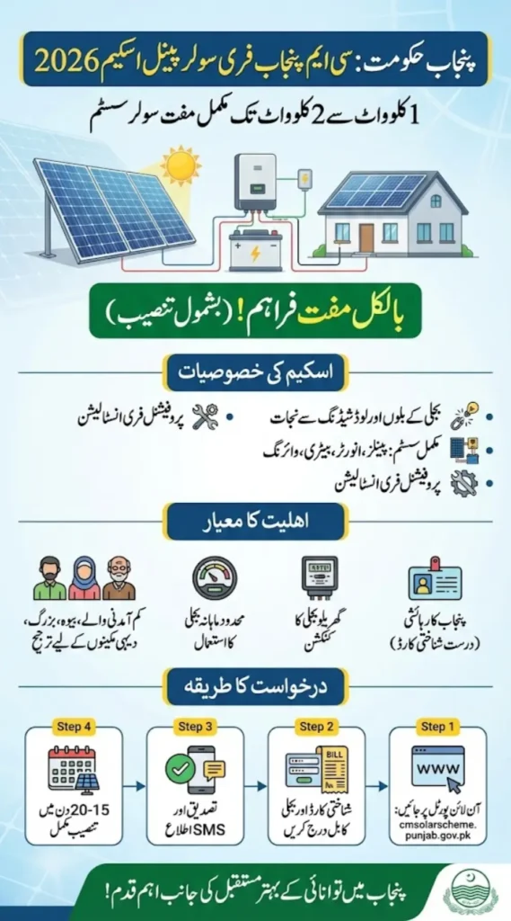 CM Punjab Solar Panel Scheme 2026 is a major government initiative offering a 100% free 1kW to 2kW solar system to eligible households across Punjab. Under this scheme, families will receive complete solar setup including panels, inverter, battery backup, and professional installation at no cost.