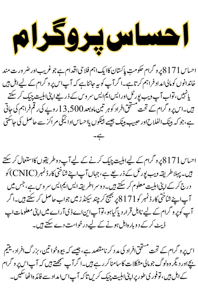 Ehsaas 8171 program is one of Pakistan’s most vital welfare initiatives, providing crucial financial assistance to low-income families, especially those who need it the most. Whether you’re a widow, a senior citizen, or someone facing financial hardship, the Ehsaas 8171 scheme offers support with Rs. 13,500 every quarter. If you’re looking to find out if you qualify for this program, checking your eligibility is easier than ever, thanks to the online portal and SMS service that allow you to do it in a few simple steps.