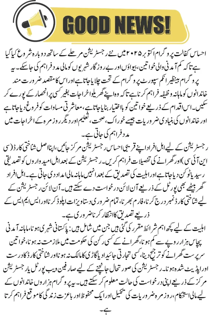 The Ehsaas Kafalat Program has reopened its new registration phase in October 2025 to support more low-income families, widows, and jobless citizens across Pakistan. This new update ensures that all deserving individuals who were left out earlier can now register easily.