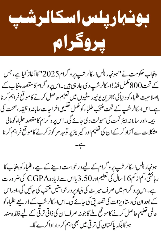 Punjab Government has recently launched the Honhaar Plus Scholarship Program 2025, an ambitious initiative designed to offer 800 fully-funded scholarships to talented students from Punjab. This program is a game-changer for students aiming to pursue higher education abroad at top global universities. What sets this program apart is its comprehensive coverage, which includes not just tuition fees, but also living expenses, health insurance, and even annual air tickets for travel between Pakistan and the host country.