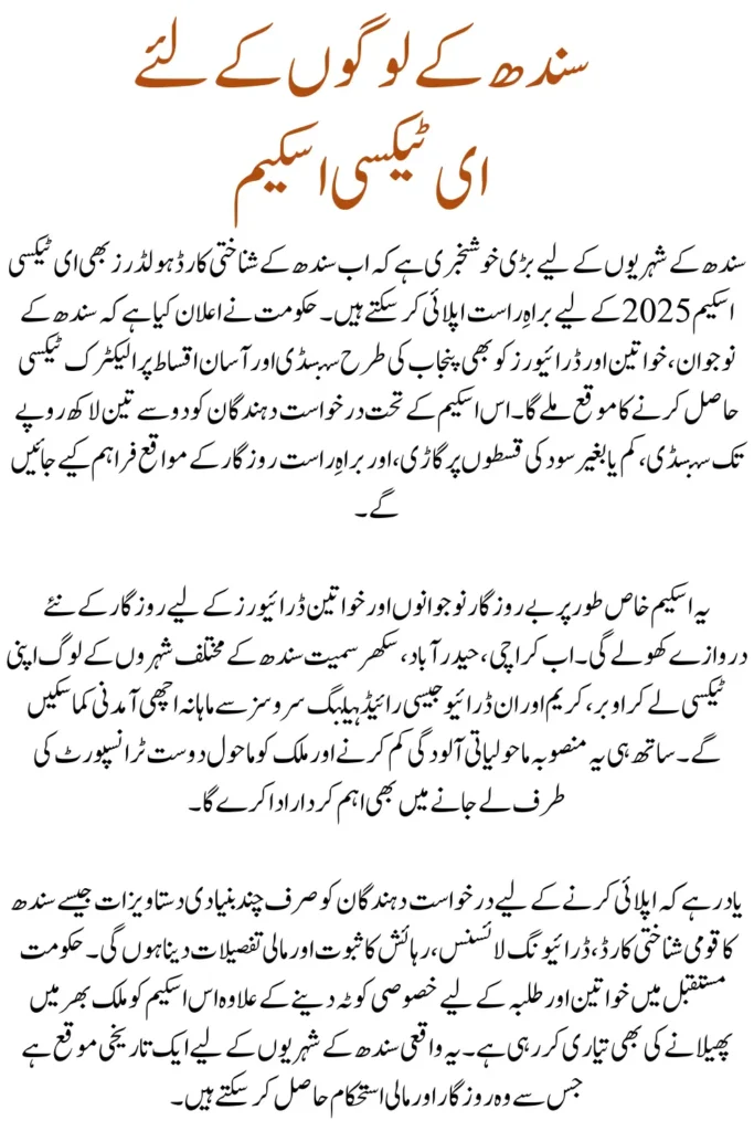 The wait is finally over Sindh CNIC holders can now officially apply for the E-Taxi Scheme 2025. For the first time, residents of Karachi, Hyderabad, Sukkur, and other Sindh cities will have direct access to eco-friendly electric taxis with government subsidies and installment support. This marks a major step in expanding green transport beyond Punjab and opening new income opportunities for Sindh’s youth.