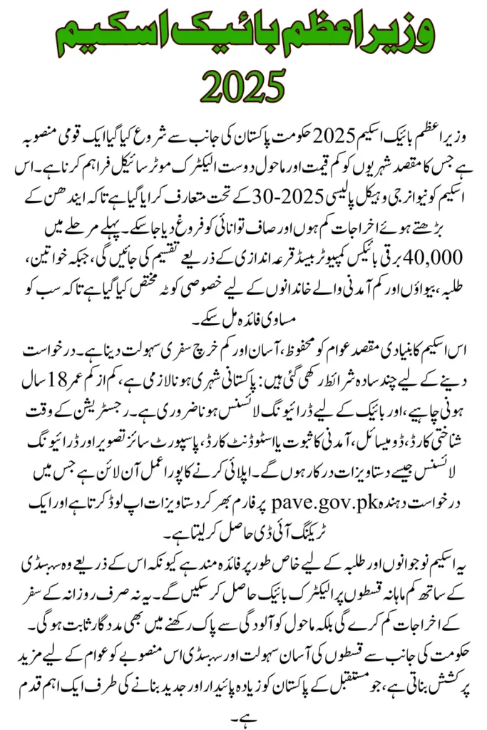 The PM Bike Scheme 2025 is a great opportunity for youth, students and low-income citizens. This scheme not only provides low-cost and eco-friendly rides but also plays a significant role in reducing transportation problems. Government subsidies, easy installments and special quotas further increase public confidence. This scheme is a step towards a sustainable and modern Pakistan for the future, where safe, affordable and clean energy-based transport will be within the reach of the common citizen.