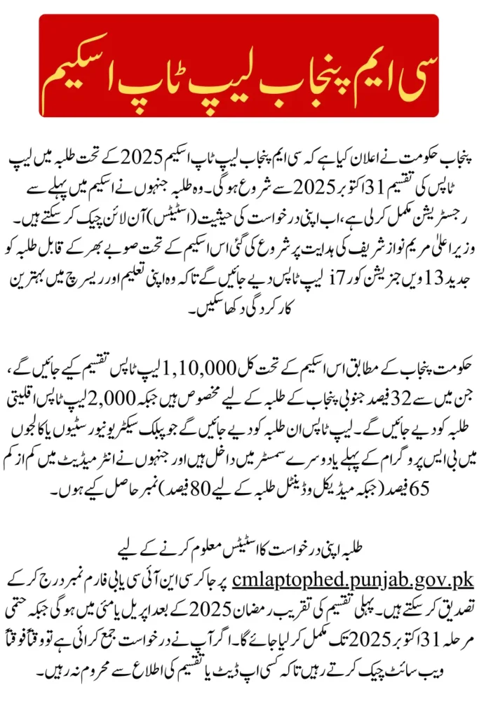 CM Punjab Laptop Scheme 2025 is a major digital education initiative by the Punjab Government to empower students with modern technology. With distribution starting from October 31, 2025, now is the time to check your application status, complete any pending verification, and prepare to receive your laptop. Led by Chief Minister Maryam Nawaz Sharif, this program is set to make higher education more accessible and technology-driven for thousands of bright minds across the province.