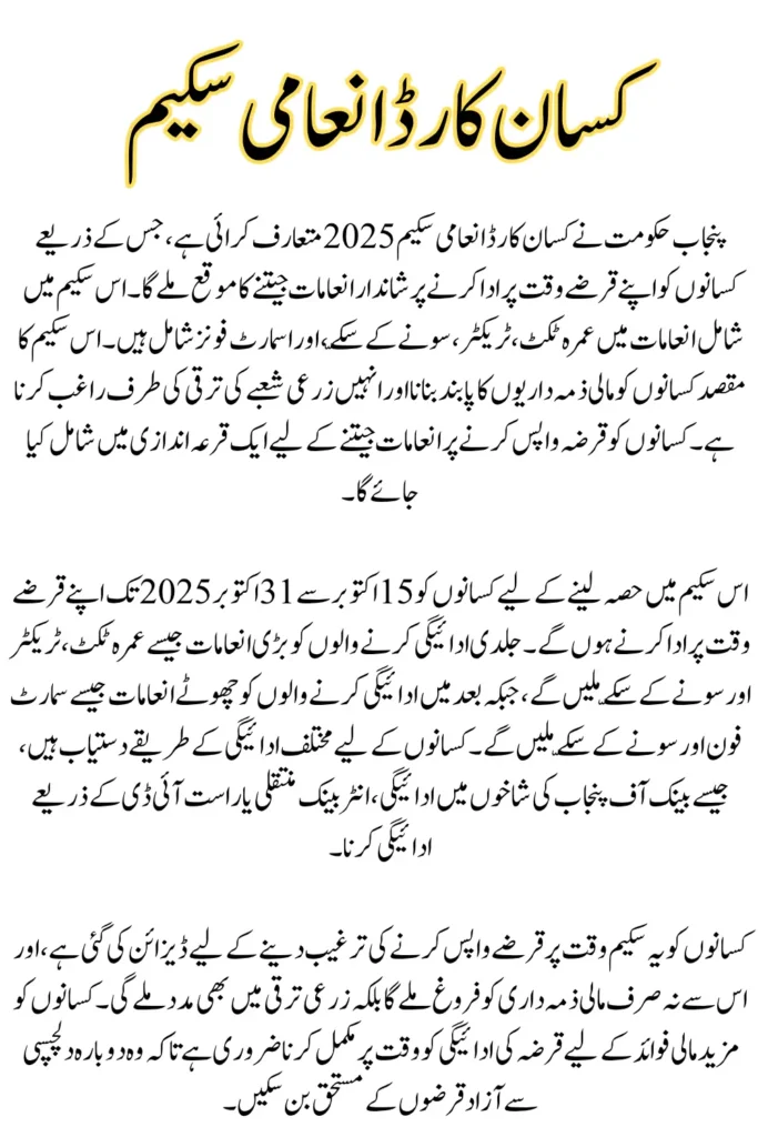 Punjab Government has launched an exciting Kisan Card Reward Scheme 2025, offering farmers across the province the opportunity to win incredible prizes such as Umrah tickets, a tractor, gold coins, and even cashback just by repaying their loans on time. This initiative is part of the government’s larger vision to promote financial discipline among farmers and support them in modernizing their agricultural practices.