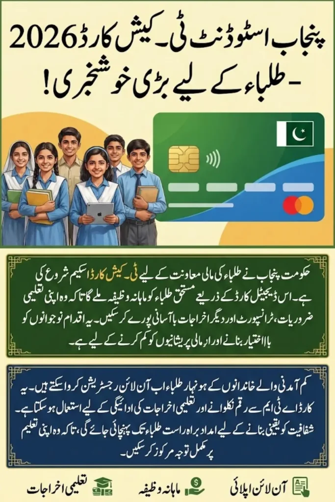 The Punjab Student T-Cash Card Scheme is a new government initiative designed to provide financial assistance to deserving students. Through this scheme, students will receive a monthly cash allowance on a digital card so that they can manage study-related expenses such as transport, books and fees. This ensures that financial issues do not affect their education.