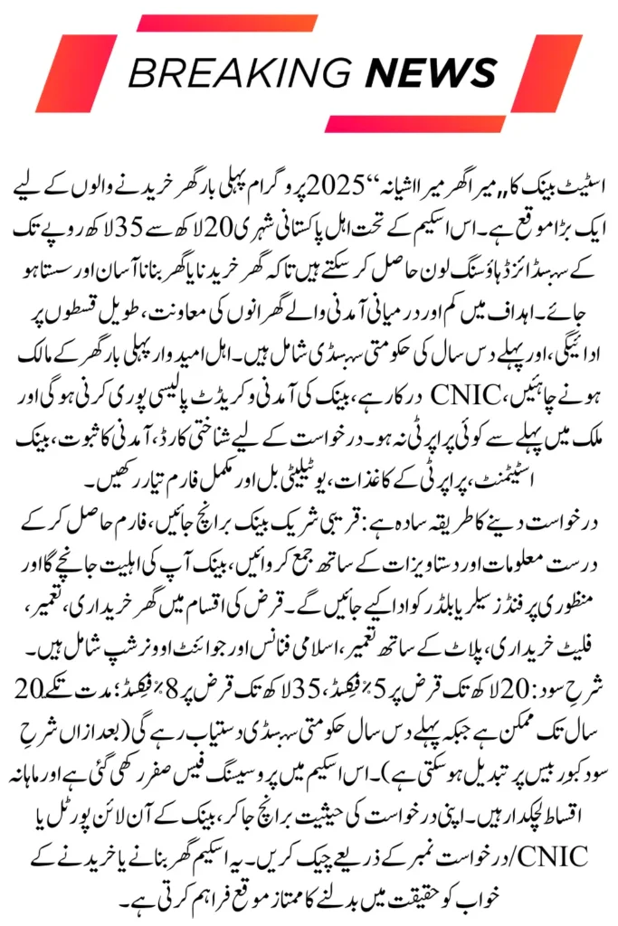 The SBP Mera Ghar Mera Ashiyana Scheme is a government-backed home financing initiative. It offers loans ranging from PKR 2 million to PKR 3.5 million, making home buying more affordable and accessible.