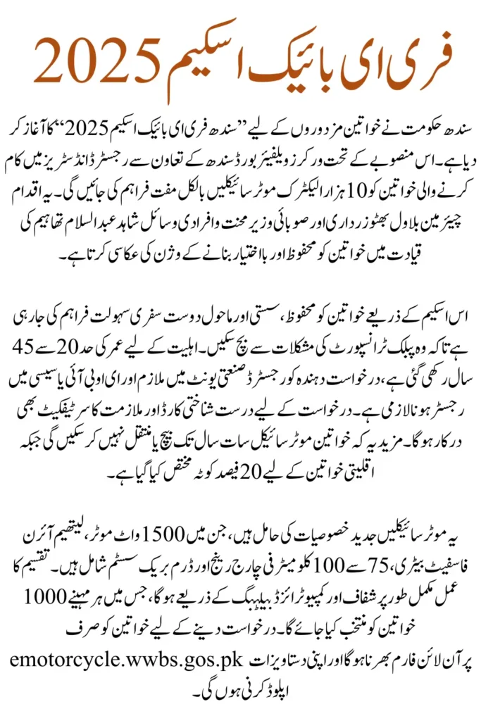 Sindh Free E-Bike Scheme 2025 has officially started, bringing a revolutionary step for women workers across the province. Launched by the Sindh Government through the Workers Welfare Board of Sindh (WWBS), the program will distribute 10,000 electric motorcycles free of cost to female employees working in registered industries.